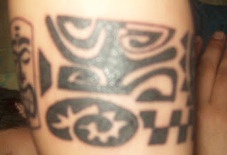 Llegamos al local (mi novio, mi cuñada y yo... A todo esto, ella se había tatuado allí el día anterior) y el tatuador le mostró a Andrés el diseño que le había preparado. A Andrés le gustó mucho y empezó la sesión. No sé si fue por el tipo de tatuaje o porque Andrés no está acostumbrado a que le saquen sangre, le pongan inyecciones y esas cosas... la cuestión es que lo sufrió muchísimo. Su brazalete está ubicado en el antebrazo derecho, no llega a tocar el codo. Quizá esa zona duele, no sé. Él también se quería hacer una máscara tiki en el cuello, pero después de eso decidió que no. Yo estaba nerviosa y como veía que le dolía tanto intentaba hablarle para que ocupara la mente en otra cosa que no fuera el dolor, pero no sirvió de nada. Cuando terminó, el tatuador declaró que había dudado de que pudiera terminarlo.