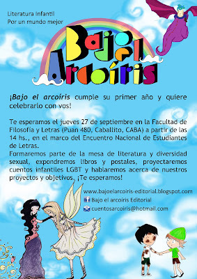 El cuento que sacamos hoy en Bajo el arcoíris trata del romance entre una chica trans y un chico. Espero que les guste. Me habría gustado publicar alguno de un chico trans, pero no tenemos ninguno. Así que si alguien quiere escribirse uno, puede mandarlo. Actualmente estamos en un stop, porque queremos difundir más los cuentos que ya tenemos (la recepción de cuentos está restringida a cuentos de dos mamás y cuentos trans). No somos una editorial comercial que necesite sacar libros todo el tiempo para mantenerse. Nuestro objetivo es la difusión, así que lxs que quieran dedicarle una entrada a este cuento hoy, o lo compartan en Facebook, Twitter o cualquier red social, ya se habrán ganado un lugar en mi corazón :)