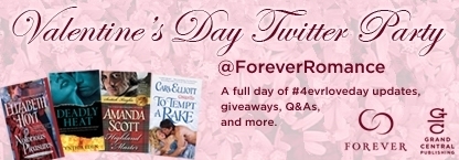 Monday is Valentine's Day and Forever Romance (my fabulous publisher) will be celebrating with a Twitter Party! …From 9 am to 5 pm EST there will be giveaways, Q&A, and lots of surprises. Be sure you're following @ForeverRomance and hashtag your tweets #4evrloveday to join the fun!