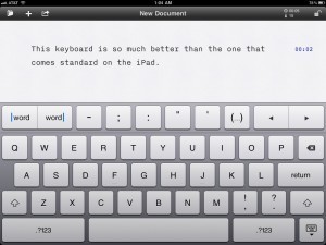 iAWriter $4.99 One of the really frustrating things about writing on the iPad is the lousy keyboard. Why didn't Apple talk to a real writer when they designed it? The folks who designed this app got it right. If it was this easy, why hasn't Apple changed the Pages keyboard to look more like this?