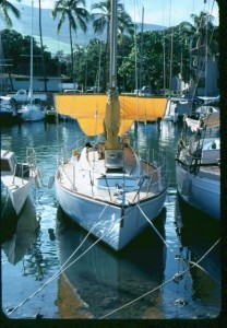 So that spring my roommate Linda and I flew to Maui and I brought my 10-speed bike as part of my baggage. We had plans to sleep on the beach, explore the islands and search for a boat that needed crew. Linda soon headed back to California, but I stayed on and I found a permanent place to sleep when I met Jack. He lived aboard a 25-foot lapstrake wooden Folkboat in Lahaina harbor that was med-moored to the seawall. Next to him was a catamaran and Jack assured me that the owner wouldn’t mind if I slept in the cat’s foreword netting. I knew that to find a crew spot, I had to be where the boats were, and I was thrilled to be off the beach.