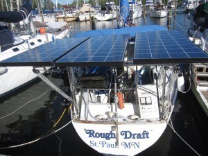 Mary and I drove to Fort Lauderdale this past week and picked up three 140 watt Kyocera solar panels for the boat. I mounted them on top of the davits and I’m hoping this will give us enough power so that we can get by without running the Honda generator while we live at anchor this winter.
