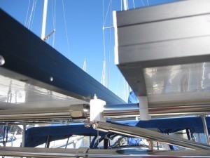 As you can see I did get the panels up, but I have one more little self inflicted problem. When I mounted the first two panels I was more worried about placing them as close to the edge of the bimini as I could and I didn’t realize I’d placed the panels so that I couldn’t unscrew two of the screws that allow me to access the wiring connectors. Today I’ll move those two panels 3/4 of an inch so that I can wire them. Next week I’ll let you know how well the panels work.