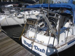 This week, after owning Rough Draft for seventeen years, I put davits on the boat. For those of you who are not boaters, davits hang off the back of the boat and are used to carry the boat’s dinghy. Here’s a picture.