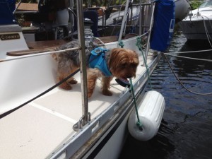 I’ve had Barney on the boat at the dock and tried to do a few little jobs out there, but I am about as effective with Barney around the boat as I am on the computer. He has already figured out how to climb the steps from the main salon to the cockpit, and he is fascinated by the water. He wants to run out on deck and stare at the water. Like many dogs who ended up loose on the street, he is frightened of loud noises. I haven’t started the engine yet – but today, in preparation, I bought a collapsable dog crate so I can at least keep him safe when I can’t attend to him underway. By the end of the summer, though, I expect I will have turned him into a good little boat dog.