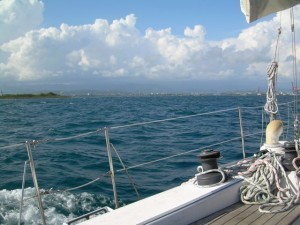 Anyway, we arrived here in PR in Mayaguez and cleared customs and immigration (because we had arrived from the Turks & Caicos) and motored down to Bouqueron on the southwest end of the island. It is a very big island. After a couple of days there, we took off at 6:00 am and rounded Cabo Rojo to the south coast and we discovered that we had used up all our good luck as far as beating into nasty winds goes. We motored straight upwind, pounding and crashing into 18-24 knots of wind and discovered that the boat could take more than we could. We had intended to go all the way to Salinas, but we stopped short in the major port of Ponce. We anchored, exhausted just off the Yacht Club and after a short dinner, we crashed early. About 10 minutes later the music started up ashore – and then we discovered it was Kareoke Night. There was only one thing that could have kept me awake that night and bad karaoke was it.
