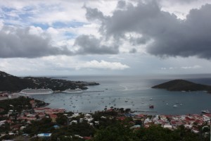 Today, we journalists were invited to take a tour around the island in the open air truck/taxi owned by Campbell Ray, our own personal driver for our stay here on St. Thomas. As the rain blew in from St John, Campbell worked the gears to get that truck up the near vertical mountain roads, driving with one hand and narrating in the microphone with the other. "This area is called Anna's Retreat," he announced. "They have the best voter turn out of any neighborhood on the island – it averages 200%" It didn't matter that squalls were strafing Pillbury Sound, and we were driving through the fog of cloud cover on the mountaintop. Campbell had us laughing and our hostesses were handing us Banana Daiquiris, and I was deciding that thanks to a little more rum, maybe I could handle this journalism gig after all.