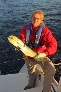 Most of the others will continue, but this crew's journey has come to an end here. More on that later. All this doesn't mean we didn't have a great time and many adventures, though. There were many hours when we sailed at five knots in 10-12 knots of wind. At the start of the race when we had strong winds for the first day, we actually saw this cat hit 9-10 knots of speed. We caught two mahi-mahi, one tuna, one marlin (that never made it onto the boat), and lots of weed. We also caught a nice ball of polypropylene line on one of the props, and I got to go swimming in mid-ocean with a sharp knife to cut it free. We ate great meals and played host to a tiny bird who joined us one night and slept in the cockpit until dawn.