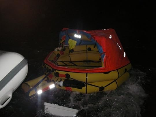 Like on any new boat, we were all getting used to the noises, the creaks and groans that any boat makes at sea. I kept claiming that I thought the boat might be haunted because I kept hearing a woman singing (finally figured out it was the autopilot). But last night as we were motoring and pounding into fifteen knots of wind rounding the infamous reefs off the north end of Bermuda on the dark of the moon, I told Bob that I'd heard another sort of singing. He stood up because he'd heard that high-pitched tone too and we both looked aft. Neither of us could believe our eyes. We were being followed by this bright orange apparition with a flashing strobe on top. Our five-man Winslow liferaft that had been stowed under the aft deck of the cat had executed a perfect launch off our stern and was merrily bobbling along at five knots in our wake. Bob and I looked at each other and said, "What the f*?" We slowed the boat and brought it up to the stern and soon realized there was no way we were going to get it aboard. So now the crew of the Emmy Kate can claim a first — we were the first boat to arrive in Bermuda at 3:00 a.m. and tie up to the Customs dock while towing a beautifully deployed liferaft, complete with drogue and water ballast pouches. And we laughed, and laughed, and laughed. What else could we do?