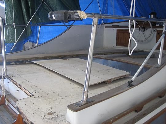 As with writing, there are certain things that go hand in hand with owning an old boat. A certain sense of adventure, I suppose. Optimism is helpful as well. Determination. Perseverance. This repair has been a long time coming. From what I'd been told, Annabel Lee's former owner was very fond of his power sander. Evidence is all around the boat, where teak has been sanded clear down to the fasteners in many places. Decks that had once been 1/2″ thick were reduced to 1/4″ or less. Of course, we're only too aware that the upper helm had more than once leaked, and in lowest spots of the bridge, (made even lower by years of zealous oversanding) the fluid ate through the bedding, followed the screws into the coring, and eventually into the cabin. Leaks, leaks and more leaks. Fortunately, our little boat has a certain unusual, exceptionally rare feature. ALL her coring, in fact all wood used in her construction, be it structural, joinery or cosmetic, is TEAK. Aside from the engine and the concrete in the ballast, if it's not fiberglass, it's teak. And the teak we've found is indeed wet, but as solid as the day the boat was built. Unfortunately large areas of the glass above and below had completely delaminated, flattening out and sinking in the process.