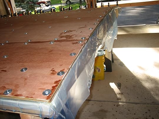 We evaluated the merit of repairing from above and below, and, after much consideration concluded the best way to do this properly would be the most drastic. We would cut away the damaged section and replace it with a new core of marine ply laminated together with epoxy resin, supported by stringers that duplicate the originals and glassed in from above and below shaped to the exact camber as the undamaged areas of the cabin. We built a frame to duplicate the actual dimensions and shape, and laminated the wood in our garage.