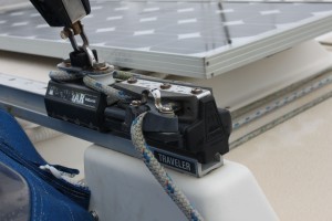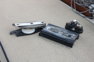 So, I left Solomons trying to head up Chesapeake Bay to get ahead of Hurricane Irene and I found myself running up the bay with 25-30 knots of wind behind me and without an autopilot, it was an exhausting sail. I made it to the South River and when I attempted a controlled gybe to enter the South River, the windward block on my mainsheet traveler exploded. I made it in to a safe anchorage for the night, but it meant that my main was then out of commission.