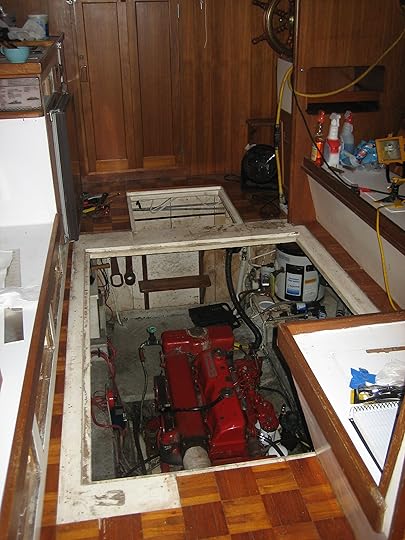 When these boats were built the engine was lowered in through a sizable opening in the salon sole. From there, the sole was finished off in teak parquet, though aboard Laura Lee it separated around that hatch, allowing full access to the engine room. There was a smaller hatch as well for day-to-day access. Aboard our boat, however, we only had that smaller hatch, which always bothered me. From within the engine room, the larger hatch was visible, though it had covered over from above.