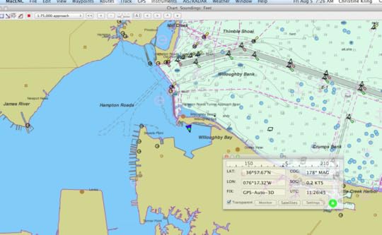 Here at Write on the Water we have this tag line, "So you want to quit your job, move onto a boat and write." You notice there is nothing in there that says I want to spend a month driving a boat to get somewhere where I can settle down and write. But that is what I chose to do and now, finally, I am here. I have made it to the Chesapeake (see this morning's position on my laptop navigation program above).