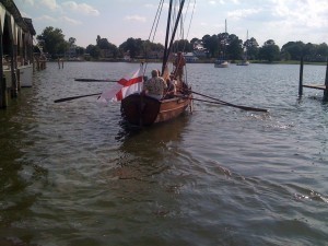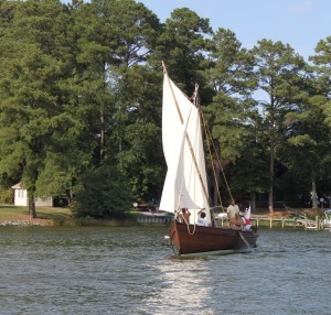 To start with when I first got my anchor down, I was nearly T-boned by a curious-looking local boat filled with a bunch of local fellows. They tried to sail upwind to clear my bow, but finally fell off and as they sailed under my stern they joked, "What would you tell your insurance man if you got rammed by a 17th century sailing vessel?" It turns out they were sailing the EXPLORER which is a replica of the 1607 scallop that Captain John Smith used to explore and chart the area around the original Jamestown settlement.