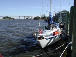 While I was in the marina at Merritt Island for a week, I tried to do all the maintenance I needed to do from figuring out my battery issues (another duh! moment when a friend pointed out that the breaker on my batteries was the problem) to repairing my autopilot, to fixing my running lights. Then I contacted my dear friend on WILD MATILDA, a Ron Holland 43, who was also heading for Charleston, and we set up a rendezvous point just north of Cape Canaveral for last Friday. In order to arrive at the waypoint on time, I had to get through a bridge before 6:00 a.m. when it started the rush-hour-curfew. But I overslept when the battery on my alarm died overnight. I started the day off two and a half hours late.
