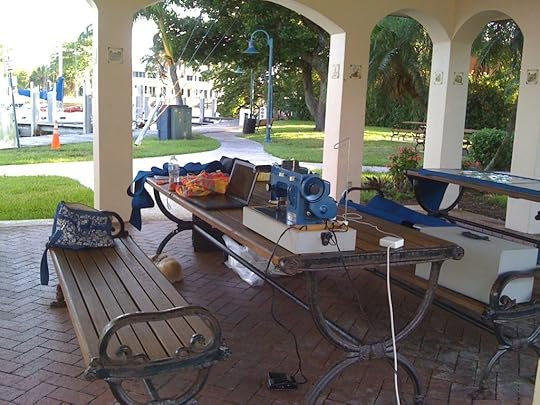Take my current project. I needed to make a new dodger and bimini for my boat. The big old bimini was mildewed and the stitching had all rotted away, so I figured I would replace it with a dodger and a bimini of my own design. Sounds easy, right? It did to me. At first. But now I find I am consumed by this sewing project. I get up, eat my breakfast in a hurry and dash out to unpack my stuff. Unlike a house, where one might have a sewing room, I do my sewing in the gazebo here at the marina. I stow the machine and the rolls of fabric and my rolling box of equipment in my car because that is easier than getting this fifty pounds of gear on and off the boat at high tide. Sometimes, I can barely get myself on and off the boat. And I sew. From morning until dusk, I am out there working on this thing. I thought it would get done this week and tomorrow is Friday, and I haven't even finished the dodger yet.