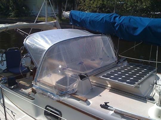 Today I planned on writing about my own problems with multitasking and about how I had turned the job of sewing our bimini over to my wife, Mary, because I couldn't spend part of the day doing boat work and then go inside and write. I even had a picture of the bimini frame with the patterning material up. (see below)