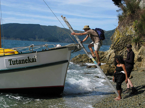 And our sailboat? Many modern designs are built with reverse transoms that serve as a built-in boat ladder. Unfortunately, no such amenity was in place in 1946 when our old wooden boat came to be. Like many traditional hulls, the thing is impossible to board from the water. Try to climb up and your legs slip down under the curvature of the hull. If you try to board from the stern it's even worse because of the way the transom is cut.