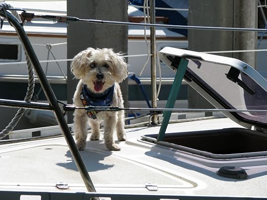 But Nosey loved to hang out on the bow, and I remember the time we were anchored in the lagoon at Sint Maarten, and we were getting strong gusty winds. In the lulls, the boat would creep up on the anchor rode, then a gust would hit and she'd sail off on a tack until she hit the end of the chain with a jerk. Little did we know, that happened once when Nosey was standing out on the anchor platform. At some point, I looked up from my book and saw the neighbor on the boat next to us. He was waving his arms and shouting, but his words were carried off by the wind. He kept pointing down. Finally, I got up and looked down at the water and there was an exhausted Nosey proving why they call it dog paddling. I never knew how long she had been in the water, but she was pretty worn out. In all those miles, though, that was the only time she went overboard.