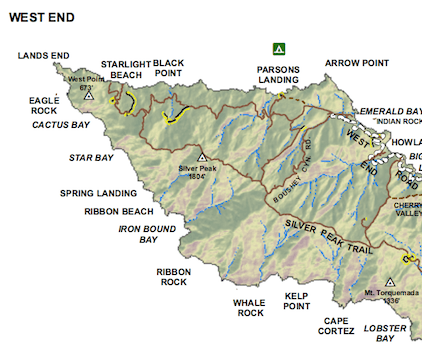 Star Bay is a small beach located approximately 1.5 miles east of Land’s End, on the south (windward) side of the island’s west end.Starlight Beach is the official beginning and endpoint of the Trans-Catalina Trail, located on the north (leeward) side of the island’s west end.