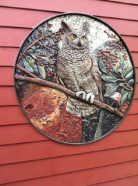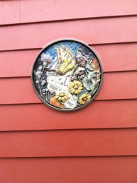 At the library, I dropped off my books. By now it was about 9:28. The library doesn’t open until 9:30 (go figure) on Saturdays, so I went around to the side of the building and snapped more pix of some wildflowers, as well as the awesome images of birds and other animals that decorate the side of the library. (The owl is definitely my favorite.)