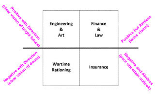 (concept courtesy of Peter Thiel and SXSW) I have been saying for a long time that these new tech entrepreneurs have a different worldview than the rest of us, and this is largely it. Let's talk about the text in the pink. For the longest time, the US and populations of other developed countries saw the world through a prism of everything getting better. Each generation felt the future was bright and getting brighter. They had optimism and a clear vision of good things to come. That can be found on the above chart in the upper left: "Positive with Direction." To US citizens, that was the way our world looked for most if not all of the 1900s and even into the early-2000s. People in this mode had a clear and positive view of the future and worked steadily toward it. But then something happened. Our world economy began to sink, and today most US citizens have moved into the mindset in the upper right: "Positive but Aimless." We are still optimistic (largely because it's a habit, I suspect) but we aren't really sure why. Bear with me, I promise the theory will be over in a just a few more words. Then we'll talk about changing our lives, right now! According to Peter, most of the rest of the developed world, China, India, Europe, etc... feel much less positive about the future. They believe things will probably get worse, even if they're not exactly sure how. These people fall into the lower right hand category: "Negative and Aimless." Now the worst category of thinkers would be in be the lower left: "Negative with Direction." These people are not only pessimistic about the future, they are also certain that it's going straight to doom and gloom. They have a vision...but it's for disaster. The terms within the quadrants describe which types of companies/systems generally thrive in each of the four environments. Of course, we all understand that "Wartime Rationing" means that almost no company is doing well. The "Insurance" section also makes sense. People that believe the future is bleak and uncertain will likely invest in insurance to cover those losses. In that quadrant, insurance companies will be the big financial winners. Peter Thiel believes this is why Warren Buffet's largely insurance-centric companies have done so well, because so many countries currently have a bleak outlook on the future. The upper-right quadrant is for companies that are optimistic but lack vision. They tend to spread their product development out among many lines (think Sony) and assume that some percentage of their goods will sell well. In truth, those successes are not at all certain, and the companies earning most in this environment are the legal and financial firms in the background. Finally (yes, we're near the end of the background stuff), companies that are "positive with direction" have a clear vision for the future and develop specific plans to get there. Pixar's and Apple's high-quality successes come to mind. The exciting thing is that anyone with clear vision and direction can not only survive but thrive in any of the four environments. That means that simply by changing our mindset we can enjoy the same bright and definite futures as those positive tech companies.