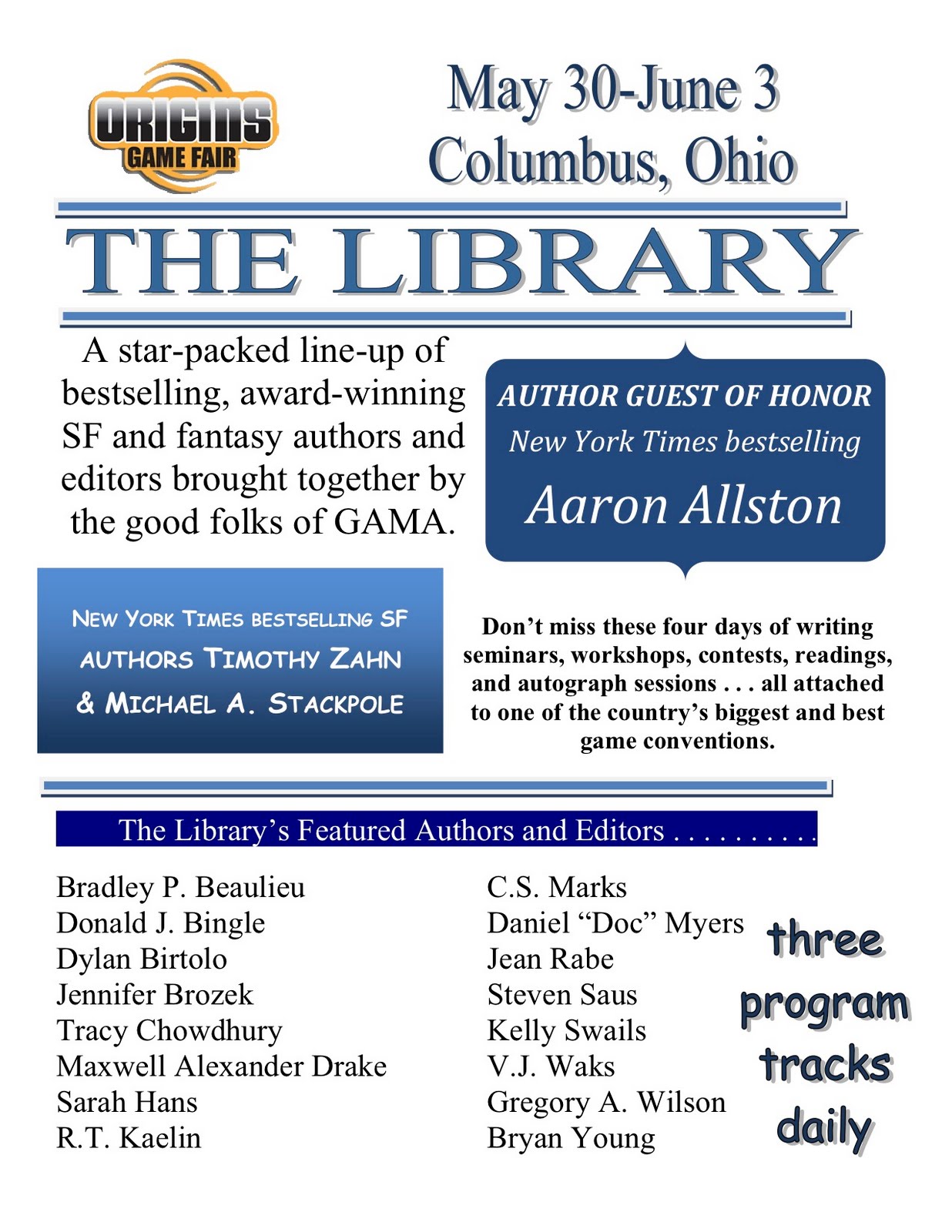 You can get more information as it's available on the Origins website and here when I'm able to announce more details. The panels I've been asked to be on are sure to be great. And if you find me boring, there are always panels with Timothy Zahn, Aaron Allston, and Mike Stackpole.