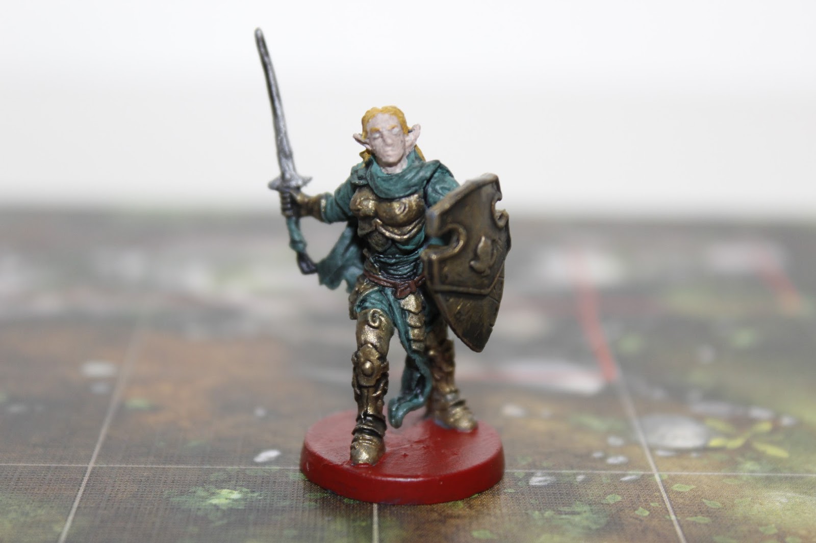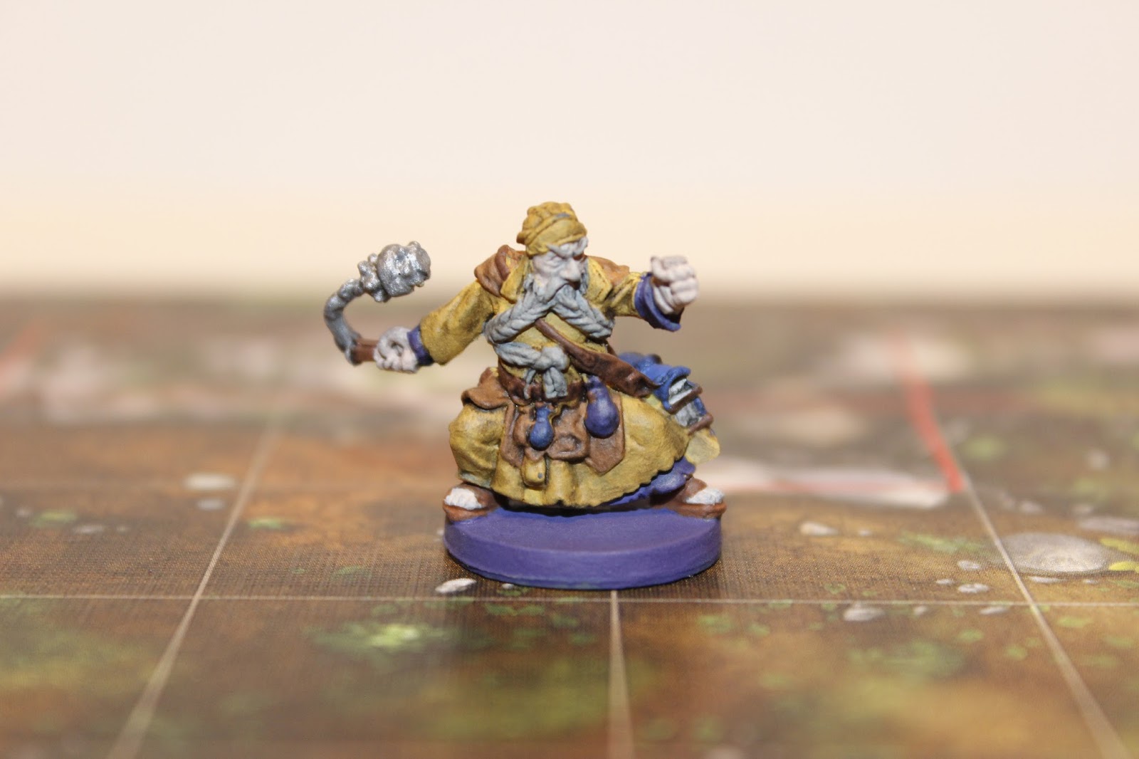 Pictured first are the hero figures. The base game comes with eight, a male and female character representing each archetype (Warrior, Mage, Healer, and Scout). Archetypes determine which classes are available for you to choose. The base game comes with eight classes, two for each archetype. Though each of these heroes was designed as a match for one of those classes, the rules allow you to choose. For example, Syndrael makes a better Knight thematically, and Grisban is clearly a Berserker; however, since both are Warriors, you could choose either class for either hero. (The class options open up even further with additional expansions.) My brother painted the heroes' bases the color of their archetype, which I think adds nice continuity between the figure and the class cards (which are similarly colored). Unlike RPGs and other similar fantasy games, the characters' races are purely thematic and have no bearing on gameplay, but I noted them anyway.