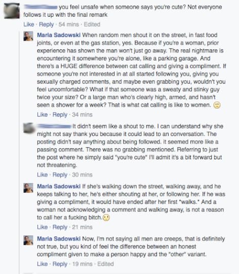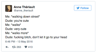 I ended up in an interesting discussion on Facebook. One of my friends - female - shared a blog post that included this screen dump of a tweet. My friend added the comment, "Your right to speak to me does not trump my right to feel safe."Predictably, one if her friends - male - wrote, "You feel safe when someone says you're cute?"