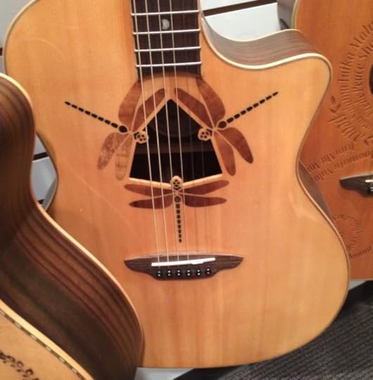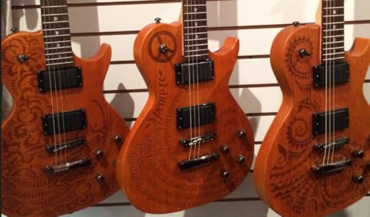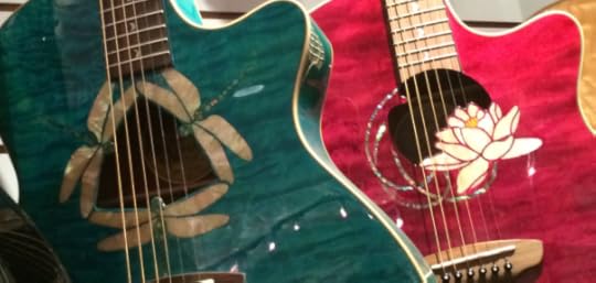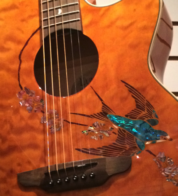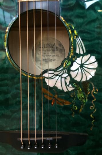 You can't really tell on the image above, but these guitars are beautiful. The brown to the west has a western motive with a prairie and running horses. Check out the below detail of the green guitar hanging in the middle. If I have my information right that's not paint - it's inlays.