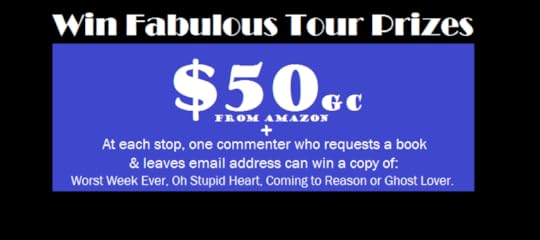 Don’t forget to enter the Rafflecopter for the $50 Gift Card.Plus, at each stop 1 commenter who requests a book and leaves their email will win one of the following:Worst Week EverOh Stupid HeartComing to ReasonGhost Lover