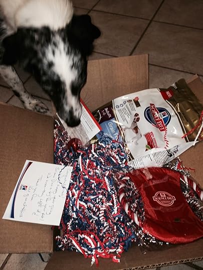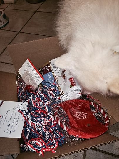 At first I was about to say that I got a perk, but it's really the doggies. Thanks to Hills Science Diet and Klout a big package arrived for them. They got food, a toy, and a light, and it was all packed in the most adorable way with greeting cards and USA-themed wrapping.