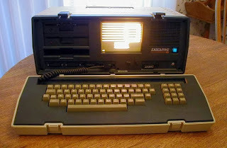 Osborne, the portable computer of 1983. It weighed nearly 24 lbs.The operating system was CP/M. It had 124 K of RAM,