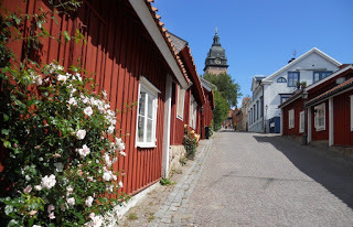 Sweden is a country where small red cottages are in abundance. They're everywhere. If you drive on a Swedish road, any Swedish road, you will see many. They even line the streets of many towns. This photo is typical us. I found it online and can't tell you which town it's from, because so many look just like this. (There's an explanation to why houses in this country tend to be red, but I'll tell you that story another day.)