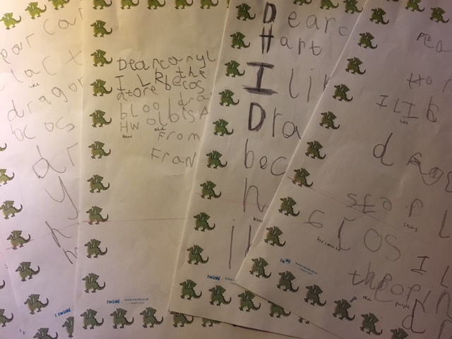 Their teacher, Deborah Laughlin, emailed in advance, asking permission to send the letters. She said, "I work as a Nurture Leader at a primary school in Colchester Essex. The children in my group love your stories, (we read a different one almost daily). They are so enthusiastic and ask lots of questions, some of which I can't answer, therefore I was wondering if it would be possible for the children to write to you?"