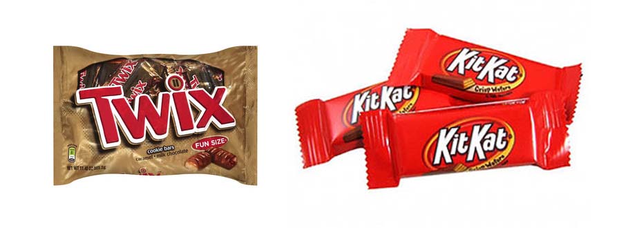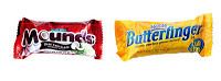 Though the numbers run close between these two, you can have 9 caramel filled kisses to the 5 miniatures. At least you'll feel like you're getting more bang for your buck (or calories, as the case may be).