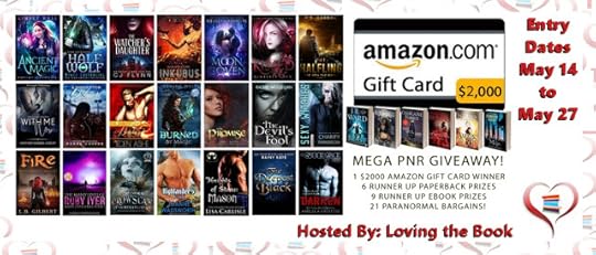 Not only will one grand prize winner snag a $2000 Gift Card, there are also a TON of fabulous runner up prizes (6 print books and 9 ebooks)!!The Beast by J.R. Ward (any format)Feverborn by Karen Marie Moning (any format)Moon Called by Patricia Briggs (ebook or paperback)Charlaine Harris, Dead until Dark (ebook or paperback)Angels’ Blood by Nalini Singh (ebook)Cold Burn of Magic by Jennifer Estep (ebook or paperback)Signed Copy of The Blackburne Legacy by Apryl BakerMagick After Midnight Boxed Set (ebook)Wolf Rampant Boxed Set (ebook)Mythean Arcana Boxed Set (ebook)Cursed by Lucy Leroux (ebook)Flower of Hell by Noree Cosper (ebook)Darkness Rising by Lisa Carlisle (ebook)Blood Warrior by H.D. Gordon (ebook)Winner’s Choice on any top 10 PR/UF book on Amazon at the time of the drawingGood luck, and don’t forget to share this giveaway with your Paranormal Romance and Urban Fantasy loving friends for extra entries to win!