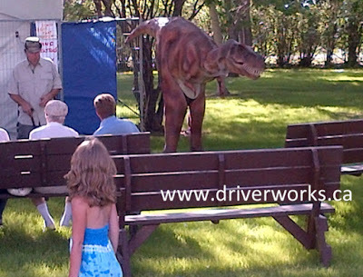 A man dressed as a dinosaur actually - moving every so often and freaking out whoever happens to look that way. It's part of an educational display to tell folks about that era.