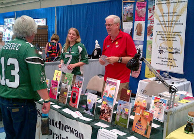 We were pleased to see people stop at the booth of STARS (Shock Trauma Air Rescue Service Foundation, which operates in Saskatchewan, Alberta and Manitoba). "STARS offers time, hope and life-saving transport to critically-injured patients."Jeffrey Dickson, the STARS community relations officer for Saskatchewan, was selling lottery tickets for STARS. My favourite line from Jeff came when a man accidentally tripped on a chair by Jeff's booth. Jeff quickly responded with, "This is the right booth if you're going to get hurt." Jeff may not be a paramedic, but he has a great sense of humour and works for a good organization.