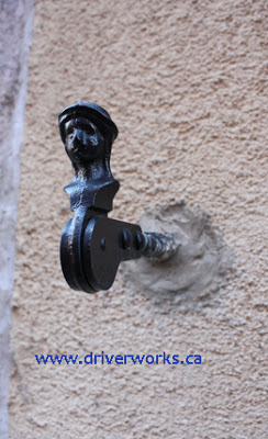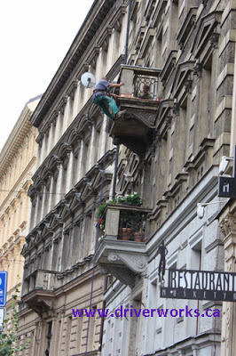 We saw this fellow, hanging from a harness and using a sander to polish the copper on these balconies. He yelled at passersby to stay out from underneath him as the corroded bits fell to the sidewalk below him.