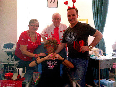 Here we are, ready to meet Dionne and Graham at the cancer clinic. As Graham so aptly wrote in his emailed My Beautiful Dionne Update #91 about that day's chemo treatment: "Me thinks someone leaked to the press what our theme was going to be. Oh well, Al and Deana ( NeverLeave Your Wingman publishers) get a big Attagirl and Attaboy for going all out!"