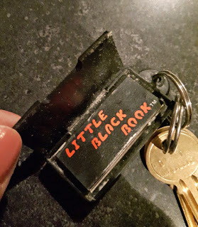 The key chain accessory is rectangular with a little door on the bottom side that opens up, revealing a fold-out piece of paper headlined "Little Black Book", just like the words on the top of the fob.