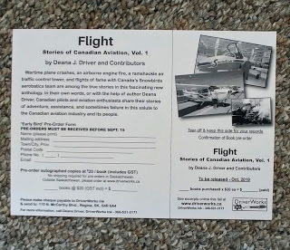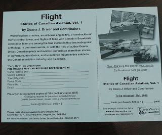 I'm co-writing (with contributors) a series of books called Flight: Stories of Canadian Aviation . The first book in the series will be released this fall. I spent more than an hour walking around the displays and tarmac area, talking with pilots and other interesting folks. I handed out the postcard below and asked them to consider submitting aviation short stories for the series or contacting me so I could interview them and write their stories. (You are welcome to share the information and your own story. You can also pre-order Volume 1 on my website.)