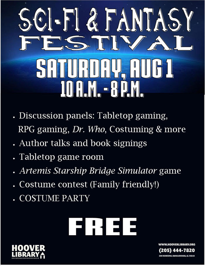 Birmingham is in desperate need of a regular SF convention. Alabama Phoenix Festival was fantastic, but there were complications that prevented it from happening this year. It's good to know that our local libraries are willing to fill the void and pick up the slack.