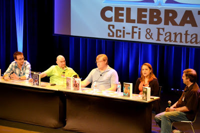 So I did that one-day SF mini-con put on by the Hoover Public Library, and it was a blast. There were gaming tracks, panels, trivia, a costume contest, and (since this was at a library after all) lots and lots of authors. Van Allen Plexico was in attendance, as were David Alastair Hayden and Pepper Thorn. I got to moderate a panel consisting of (above, L-R) S.L. Duncan, Lou Anders, J.F. Lewis, and Ingrid Seymour. Read their stuff.