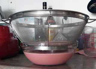 Step Three: Strain with a fine sieve. I set mine over the same bowl that I used for collecting watermelon, mostly because I hate washing extra dishes. This step isn't absolutely necessary, but straining produces a cleaner product. Someone more creative than I am could probably think of a good use for the watermelon foam; as for me, it's headed straight for the sink.