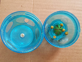 The Egg-Cersizer is, evidently, an egg-shaped toy that can be filled with food pellets. It consists of two halves. The top portion can be broken down into two parts: an outer layer with three quarter-sized, fixed openings, and an inner, movable layer with five openings. By adjusting the inner layer with the dial at the top, you change how much the openings in the two layers overlap. In other words, you can change up how a) how many openings you use at a time (max 3), and b) how large/small to make them. I started off using three openings at half-size, just to acclimate my cat to the new method of feeding. Once she got the hand of it, I adjusted it down to two openings, then one. After a month or so, I started using one opening at the smallest setting that will still allow pellets to come out.