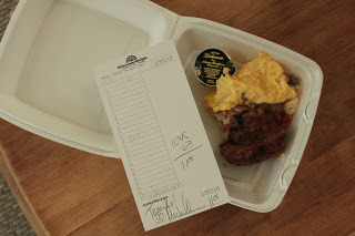 Now this place usually requires a minimum of a thirty minute wait. One of the benefits of being both early and alone, however, is that one can be seated closer to the twenty minute mark. (When you're hungry, those six hundred seconds make a very big difference!) In the picture, you can see what remained of a seafood omelette and a blueberry muffin. Quite yummy, in fact, though a far cry from the French toast that I had originally craved, the same hunger that dragged me out from my house on a chilly morning.