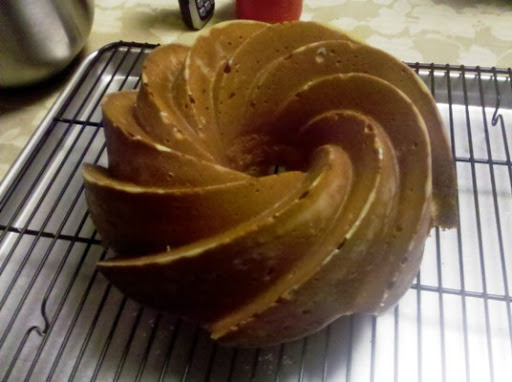 While not as perfect as the cake on the packaging, my first bundt cake is nevertheless a source of pride, if only because it didn't wind up stuck to the pan. It was also a learning experience: when the instructions advise you to spread the batter higher on the sides than in the center, a thirty-degree incline is insufficient. Next time, I shall aim closer to sixty or seventy degrees.